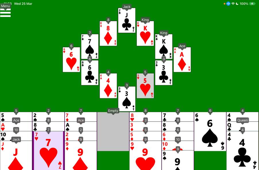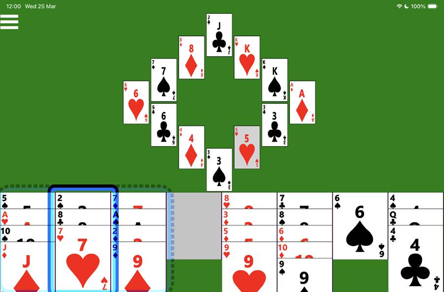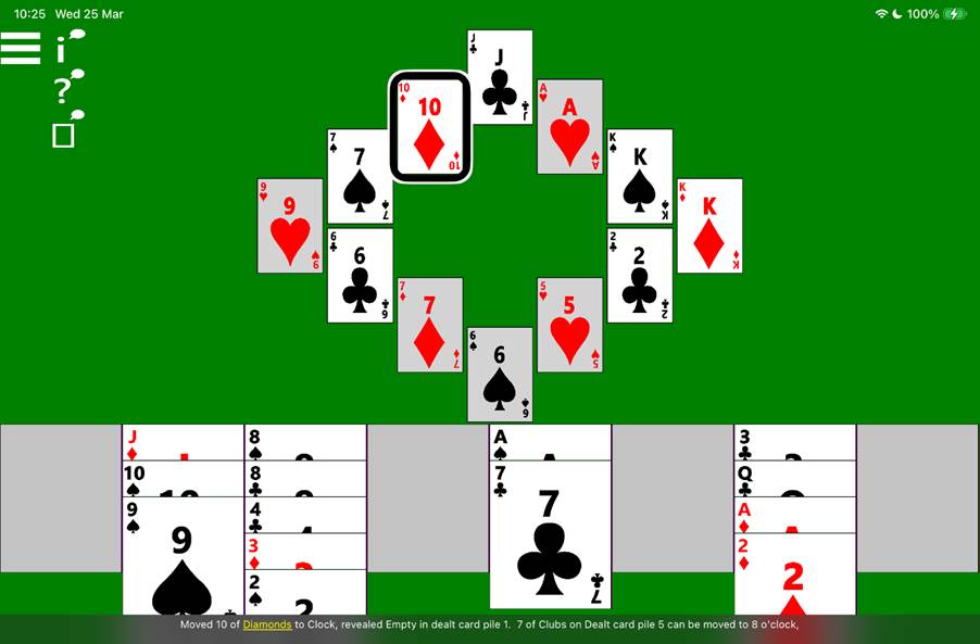 To help with faster navigation, the four cards at 12 o’clock, 3 o’clock, 6 o’clock, and 9 o’clock, can be made headings, meaning the related swipe gesture while VoiceOver is in the dealt card piles will move VoiceOver directly to the clock. To have the four clock cards be headings, turn on the related setting in the app Settings page. Please do not turn on this setting if you’re planning to use Voice Control to play the game using your voice.