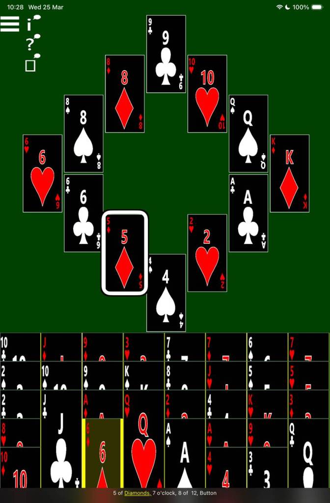 When VoiceOver navigates to one of the clock cards, it announces the rank and suit of the card, then its position in the clock, and finally its position in the set of clock cards. For example, “Jack of Clubs, 12 o’clock, 1 of 12, Button”, or “3 of Spades, 6 o’clock, 7 of 12, Button”.