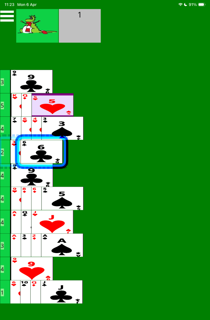 The following picture shows an in-progress game of the accessible Spider solitaire game. The iOS Switch Control feature is drawing a faint blue dotted rectangle around the fourth dealt card pile, and a solid blue rectangle around the 6 of Clubs in that pile.