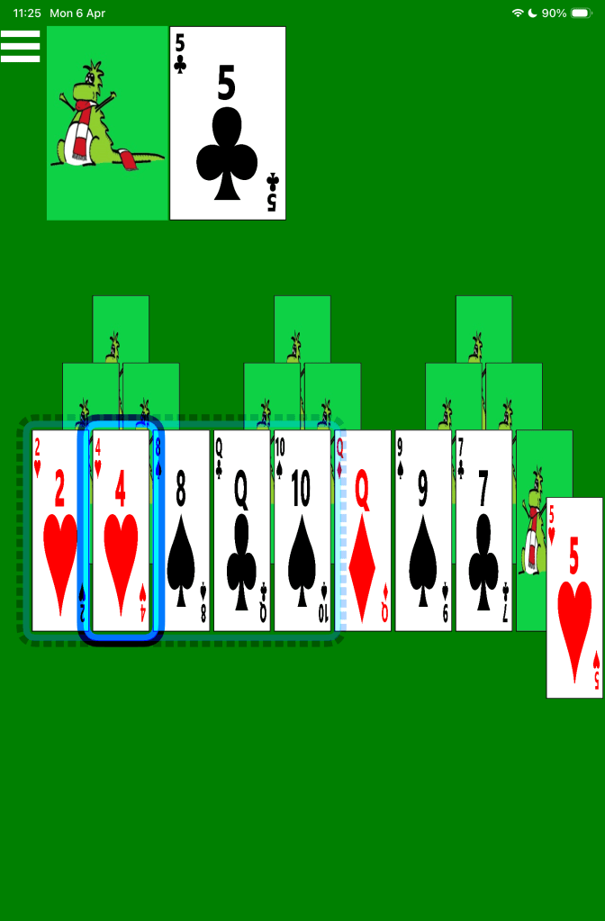 The following picture shows an in-progress game of the accessible Tri Peaks solitaire game. The iOS Switch Control feature is drawing a faint blue dotted rectangle around the first five cards in the third row of dealt cards, and a solid blue rectangle around the 4 of Hearts amongst those five cards.