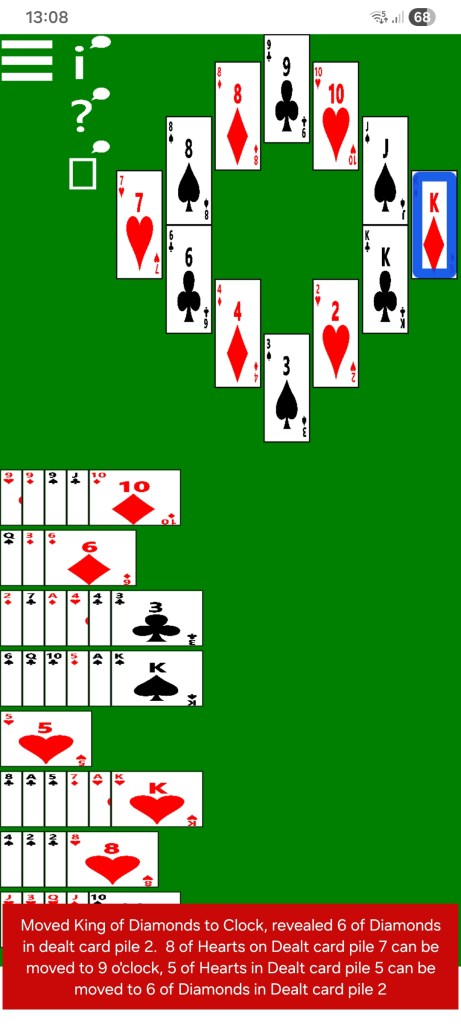 The following picture shows an in-progress game of the accessible Grandfather’s Clock solitaire game. The Android TalkBack feature is highlighting the King of Diamonds at 3 o’clock in the clock cards, and its caption is: “Moved King of Diamonds to Clock, revealed 6 of Diamonds in dealt card pile 2. 8 of Hearts on Dealt card pile 7 can be moved to 9 o’clock, 5 of Hearts in Dealt card pile 5 can be moved to 6 of Diamonds in Dealt card pile 2”.