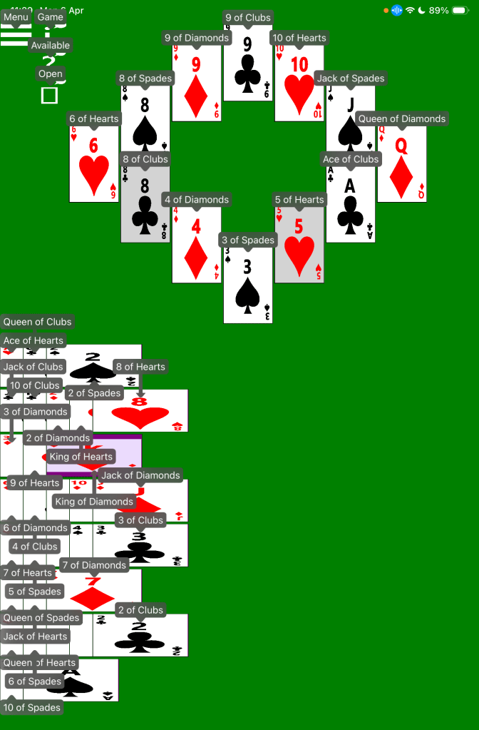 The following picture shows an in-progress game of the accessible Grandfather’s Clock solitaire game. The iOS Voice Control feature shows text by every button in the game, for example, “Menu”, “Game”, “9 of Clubs”, “3 of Spades”, “8 of Hearts”.