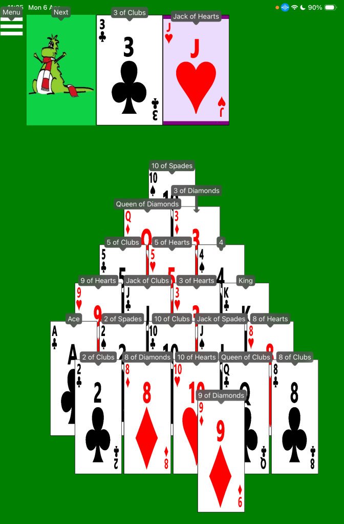 The following picture shows an in-progress game of the accessible Pyramid solitaire game. The iOS Voice Control feature shows text by every button in the game, for example, “Menu”, “Next”, “3 of Clubs”, “Jack of Hearts”, “9 of Diamonds”.