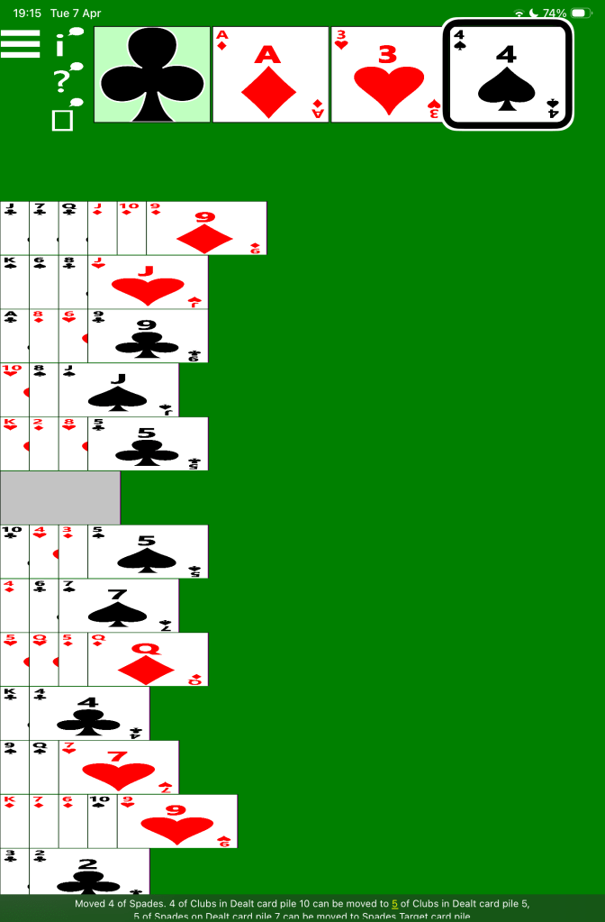 The following picture shows an in-progress game of the accessible Baker’s Dozen solitaire game. The iOS VoiceOver feature is highlighting the 4 of Spades in the Spades target card pile, and its caption is: “Moved 4 of Spades. 4 of Clubs in Dealt card pile 10 can be moved to 5 of Clubs in Dealt card pile 5, 6 of Spades on Dealt card pile 7 can be moved to Spades Target card pile”.