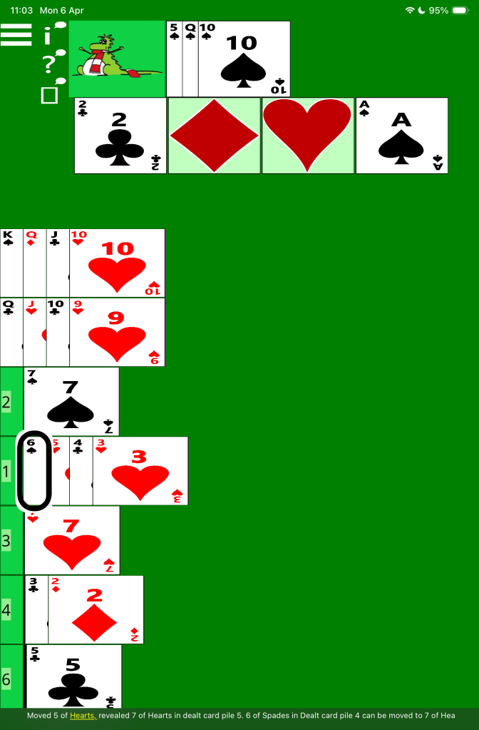 The following picture shows an in-progress game of the accessible Klondike solitaire game. The iOS VoiceOver feature is highlighting the 6 of Spades in the fourth dealt card pile, and its truncated caption is: “Moved 5 of Hearts, revealed 7 of Hearts in dealt card pile 5. 6 of Spades in Dealt card pile 4 can be moved to 7 of Hea”.