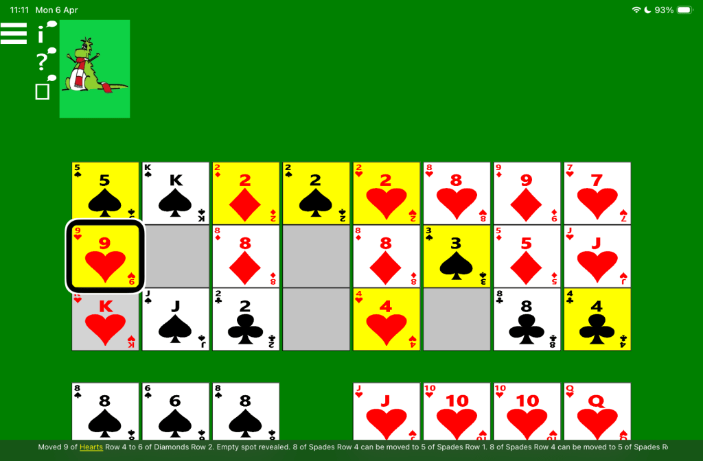 The following picture shows an in-progress game of the accessible Royal Parade solitaire game, in landscape orientation. The iOS VoiceOver feature is highlighting the 9 of Hearts in the second row of dealt cards, and its truncated caption is: “Moved 9 of Hearts Row 4 to 6 of Diamonds Row 2. Empty spot revealed. 8 of Spades Row 4 can be moved to 5 of Spades Row 1. 8 of Spades Row 4 can be moved to 5 of Spades Ro”.
