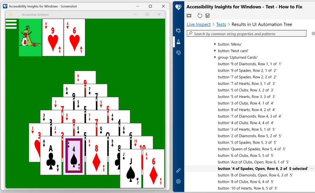 The following picture shows an in-progress game of the accessible Pyramid solitaire game running on Windows. The Accessibility Insights for Windows tool is reporting the programmatic interface of the app. The tool shows that all the cards in the pyramid are represented as Buttons, with their names made up of the rank and suit of the card, followed by “Open” if the card can be selected, followed by the row index and the position of the card in the row, and finally followed by “selected” if the card is currently selected. For example, “9 of Diamonds, Row 1, 1 of 1”, “4 of Spades, Open, Row 6, 2 of 5 selected”.